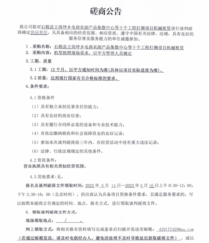 石棉縣王崗坪鄉(xiāng)電商農(nóng)副產(chǎn)品集散中心等十個工程打捆項(xiàng)目機(jī)械租賃談判磋商公告