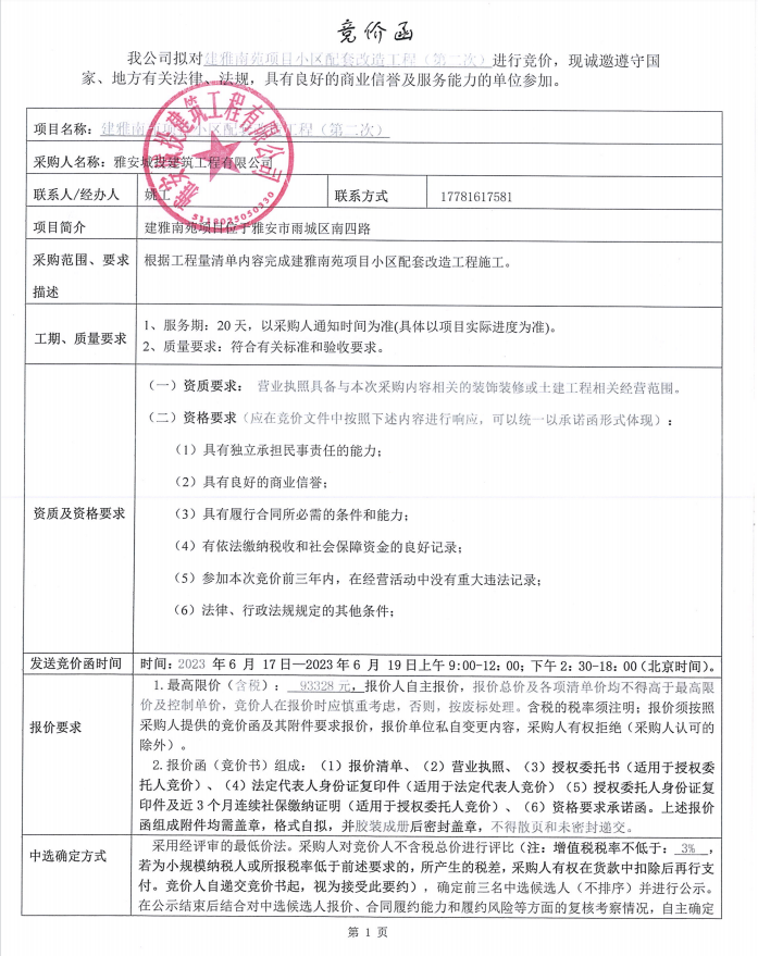 建雅南苑項(xiàng)目小區(qū)配套改造工程(第二次)競(jìng)價(jià)公告