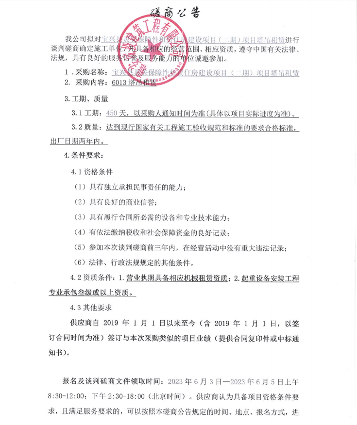 寶興縣靈關(guān)保障性租賃住房建設(shè)項目(二期)項目塔吊租賃談判磋商公告