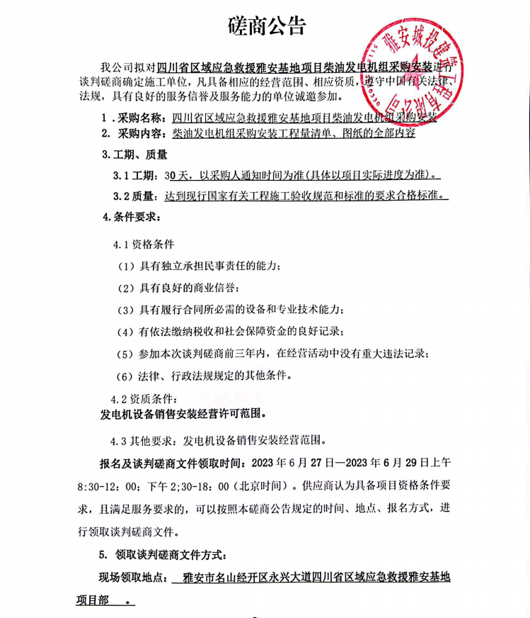 四川省區(qū)域應(yīng)急救援雅安基地項(xiàng)目柴油發(fā)電機(jī)組采購安裝談判磋商公告