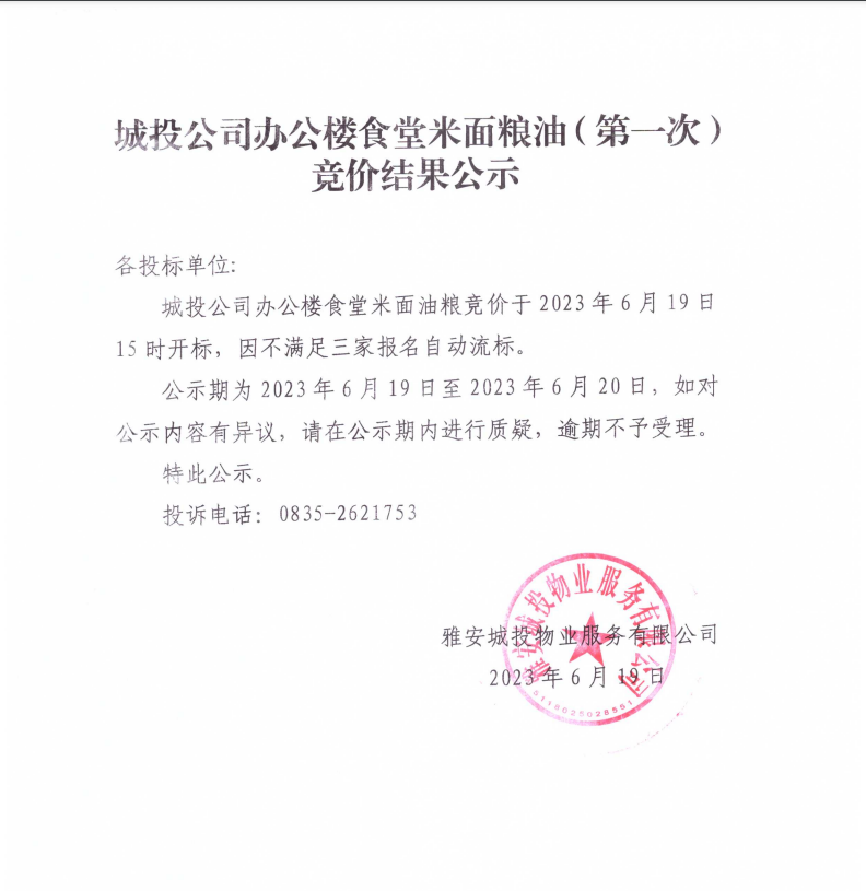 城投公司辦公樓食堂米面糧油(第一次)競(jìng)價(jià)結(jié)果公示