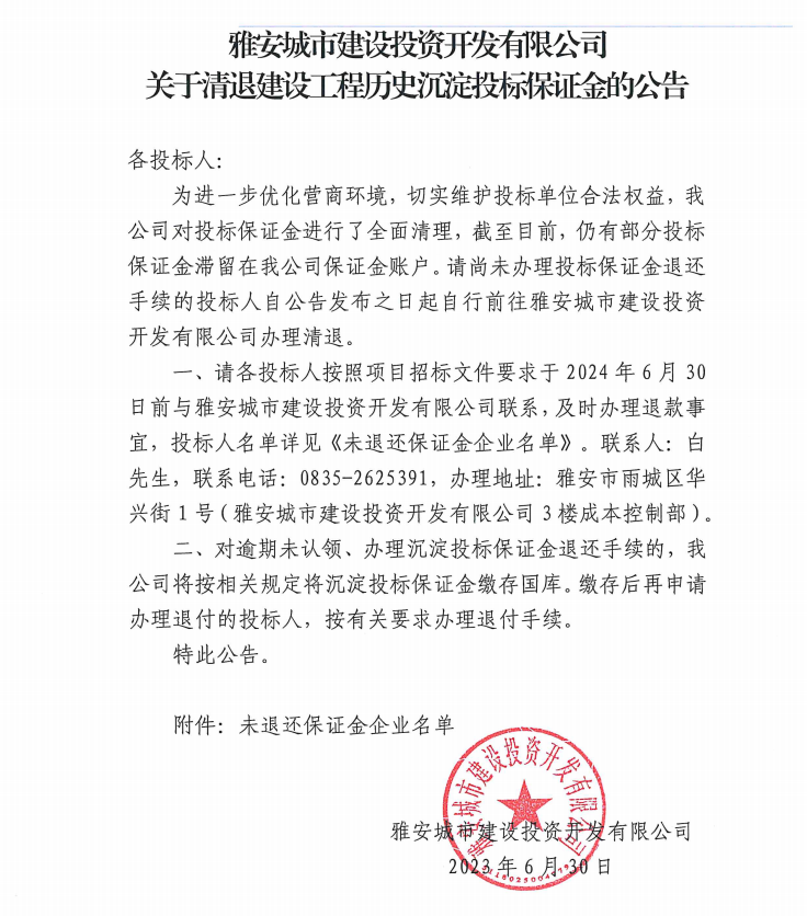雅安城市建設(shè)投資開發(fā)有限公司關(guān)于清退建設(shè)工程歷史沉淀投標保證金的公告