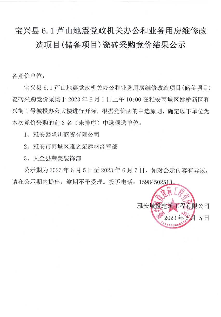 寶興縣6.1蘆山地震黨政機關(guān)辦公和業(yè)務(wù)用房維修改造項目(儲備項目)瓷磚采購競價結(jié)果公示