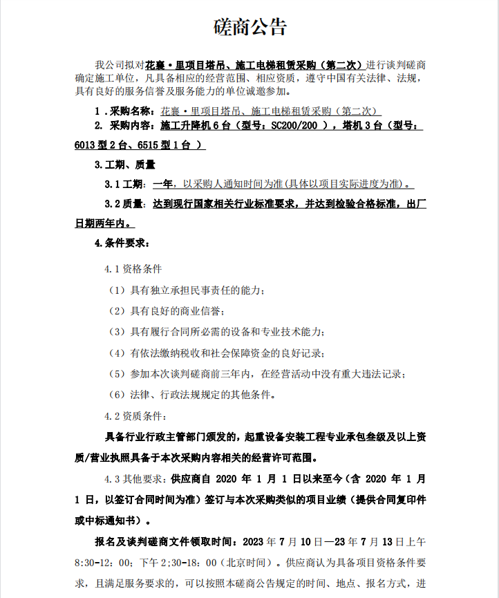 花襄·里項(xiàng)目塔吊、施工電梯租賃采購(gòu)(第二次)談判磋商公告