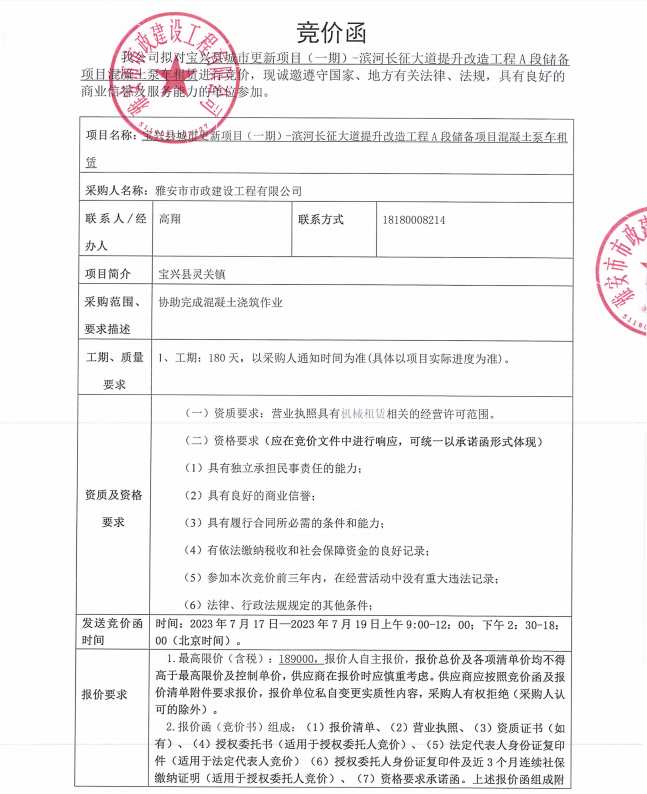 寶興縣城市更新項(xiàng)目(一期)-濱河長(zhǎng)征大道提升改造工程A段儲(chǔ)備項(xiàng)目混凝土泵車租賃競(jìng)價(jià)公告