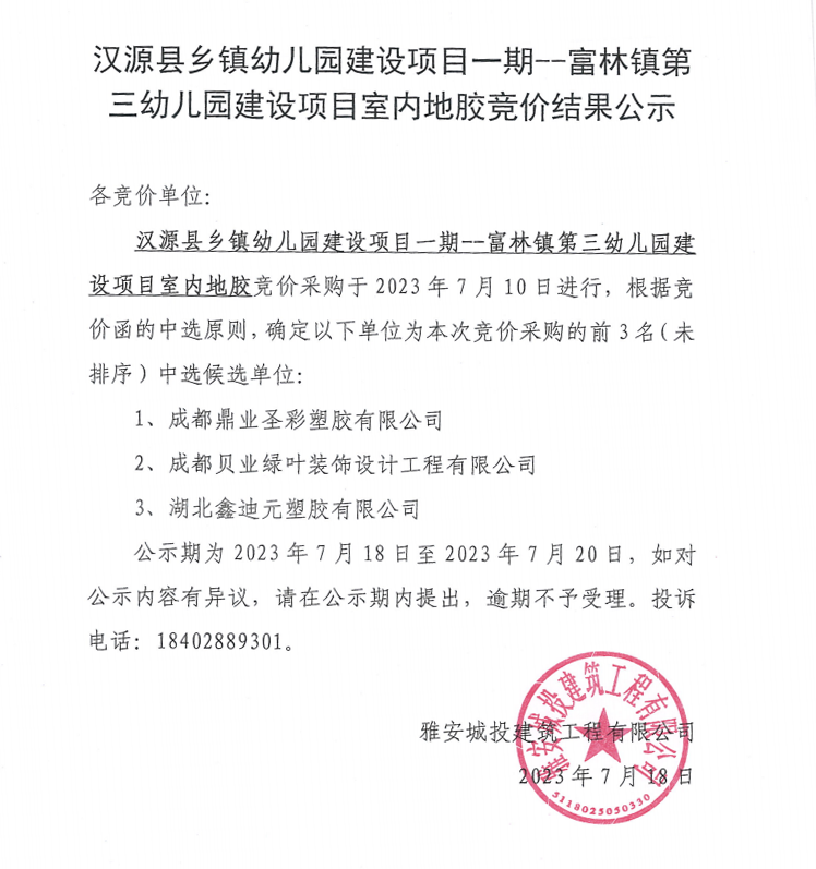 漢源縣鄉(xiāng)鎮(zhèn)幼兒園建設項目一期--富林鎮(zhèn)第三幼兒園建設項目室內地膠競價結果公示