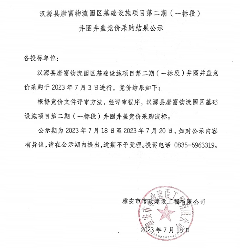 漢源縣唐富物流園區(qū)基礎(chǔ)設(shè)施項(xiàng)目第二期(一標(biāo)段)井圈井蓋競價采購結(jié)果公示
