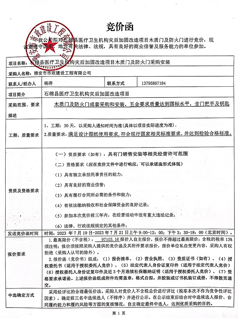 石棉縣醫(yī)療衛(wèi)生機構(gòu)災(zāi)后加固改造項目木質(zhì)門及防火門采購安裝競價公告