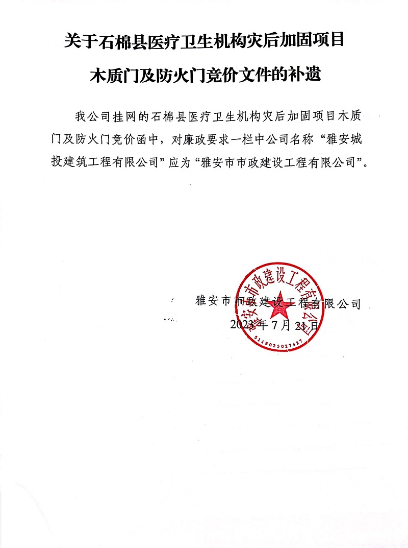 關(guān)于石棉縣醫(yī)療衛(wèi)生機(jī)構(gòu)災(zāi)后加固項(xiàng)目木質(zhì)門及防火門競價(jià)文件的補(bǔ)遺