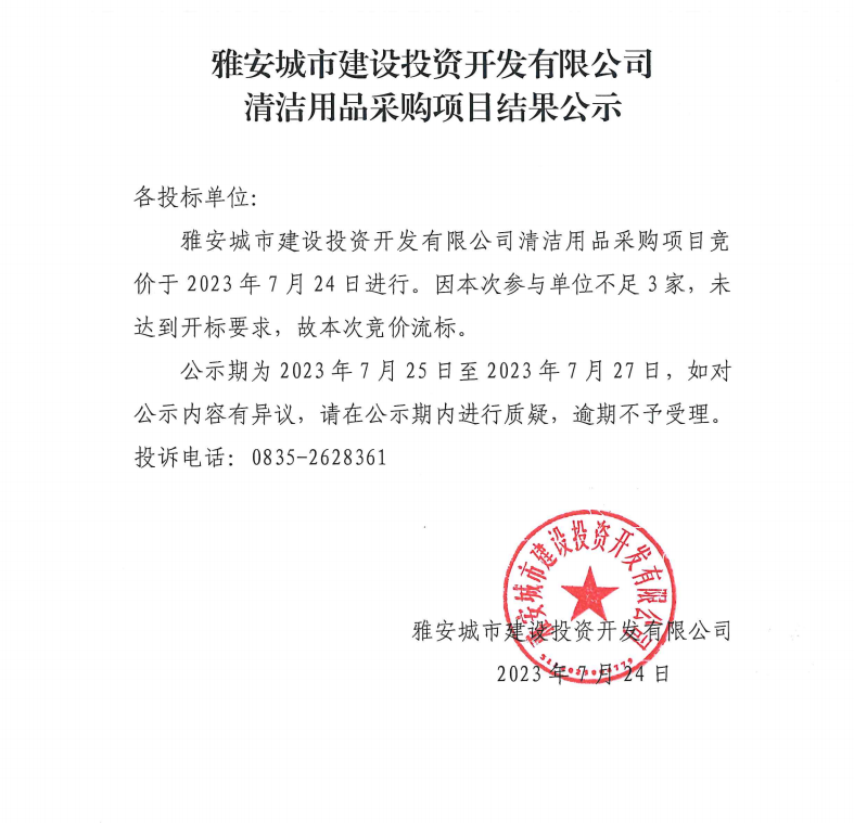 雅安城市建設投資開發(fā)有限公司清潔用品采購項目結果公示