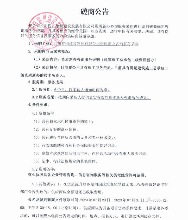 四川黎州建設(shè)發(fā)展有限公司資質(zhì)新辦咨詢服務(wù)采購(gòu)談判磋商公告