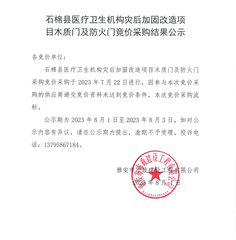 石棉縣醫(yī)療衛(wèi)生機(jī)構(gòu)災(zāi)后加固改造項(xiàng)目木質(zhì)門及防火門競價(jià)采購結(jié)果公示