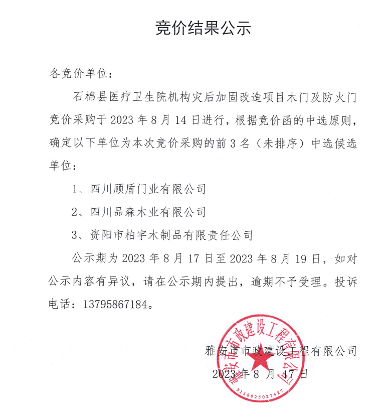 石棉縣醫(yī)療衛(wèi)生院機(jī)構(gòu)災(zāi)后加固改造項(xiàng)目木門及防火門競價(jià)采購結(jié)果公示