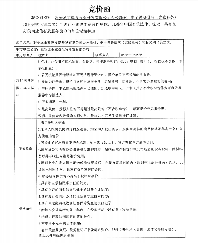 雅安城市建設(shè)投資開發(fā)有限公司辦公耗材、電子設(shè)備供應(yīng)(維修服務(wù))項(xiàng)目采購(第二次)公告