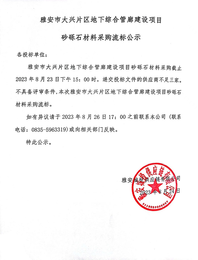 雅安市大興片區(qū)地下綜合管廊建設(shè)項(xiàng)目砂礫材料采購(gòu)流標(biāo)公示