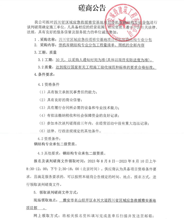 四川省區(qū)域應急救援雅安基地項目停機庫鋼結(jié)構(gòu)專業(yè)分包談判磋商公告