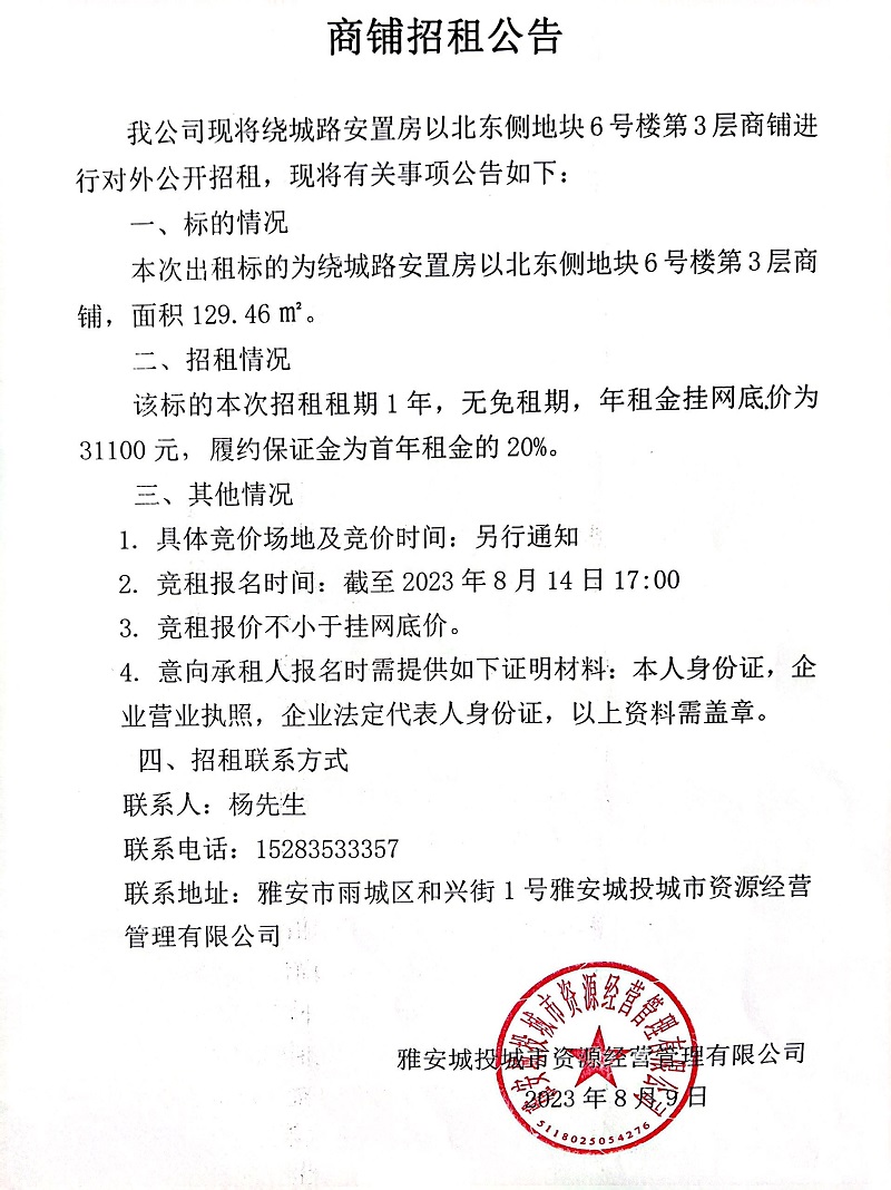 繞城路安置房以北東側地塊6號樓第3層商鋪招租公告