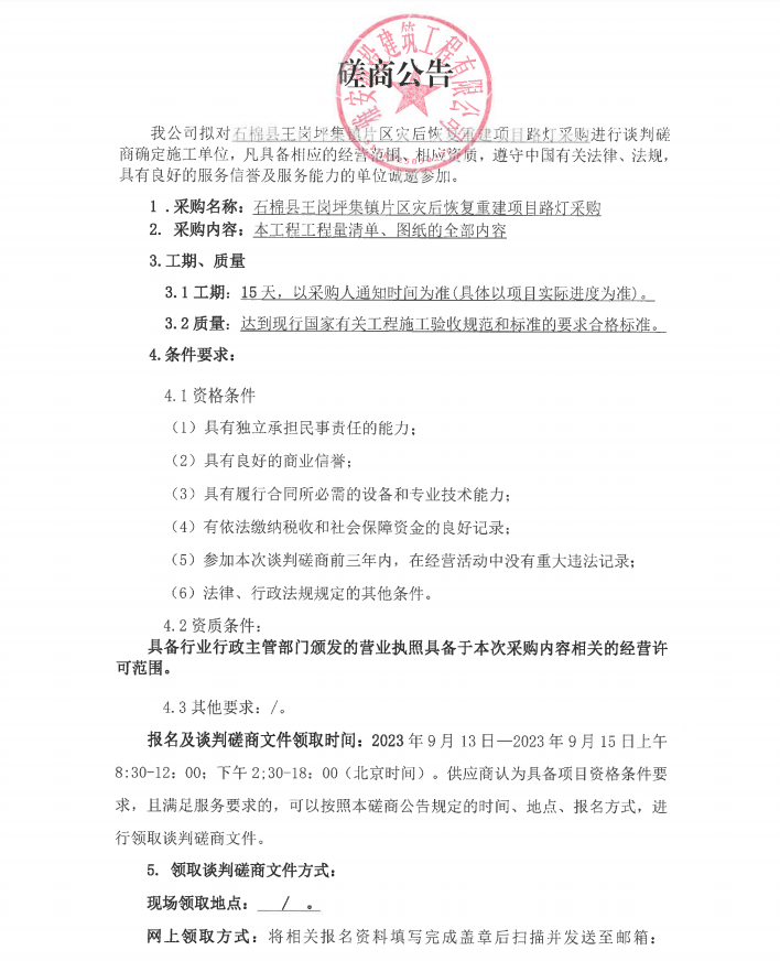 石棉縣王崗坪集鎮(zhèn)片區(qū)災(zāi)后恢復(fù)重建項目路燈采購談判磋商公告