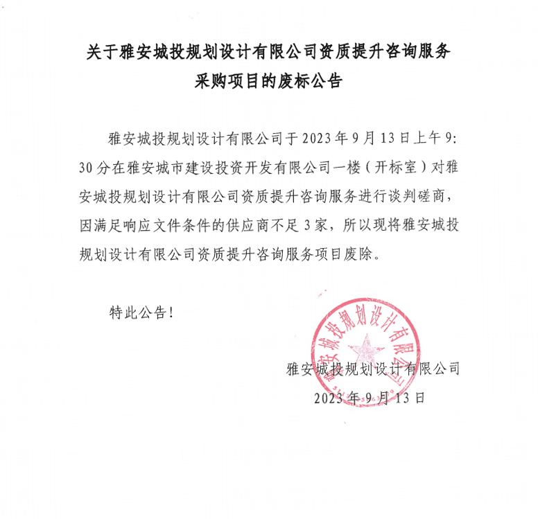 關(guān)于雅安城投規(guī)劃設(shè)計有限公司資質(zhì)提升咨詢服務(wù)采購項目的廢標(biāo)公告