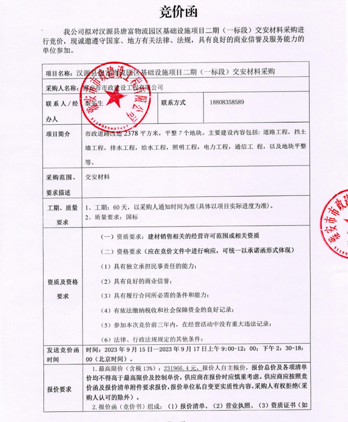 漢源縣唐富物流園區(qū)基礎(chǔ)設(shè)施項(xiàng)目二期(一標(biāo)段)交安材料采購競價(jià)公告