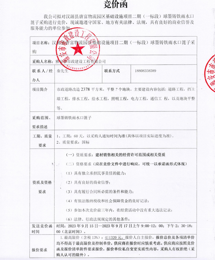 漢源縣唐富物流園區(qū)基礎(chǔ)設(shè)施項(xiàng)目二期(一標(biāo)段)球墨鑄鐵雨水口篦子采購(gòu)競(jìng)價(jià)公告