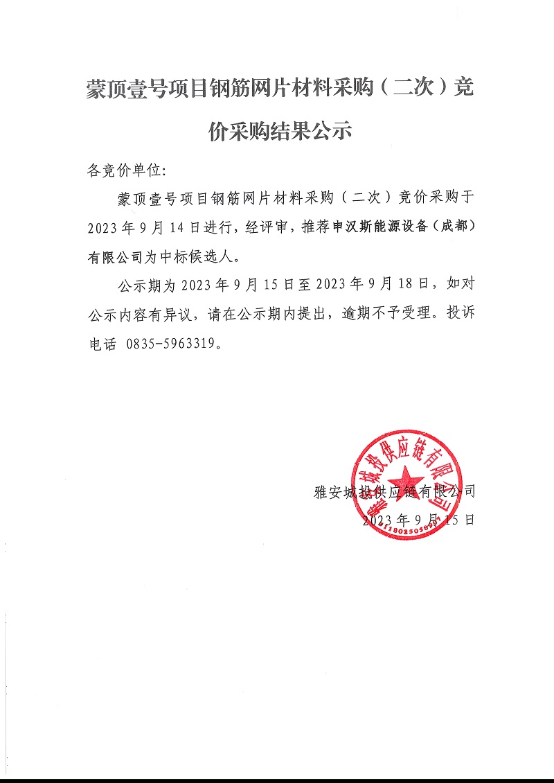 蒙頂壹號(hào)項(xiàng)目鋼筋網(wǎng)片材料采購(二次)競(jìng)價(jià)采購結(jié)果公示