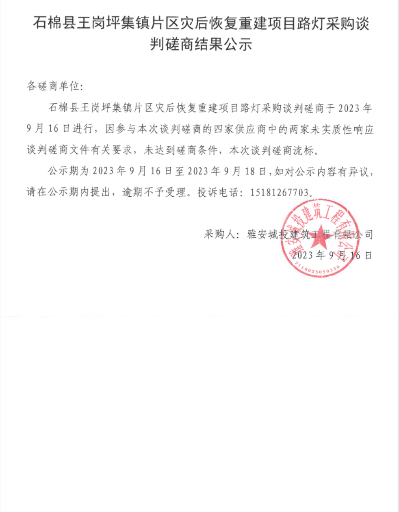 石棉縣王崗坪集鎮(zhèn)片區(qū)災(zāi)后恢復(fù)重建項(xiàng)目路燈采購談判磋商結(jié)果公示