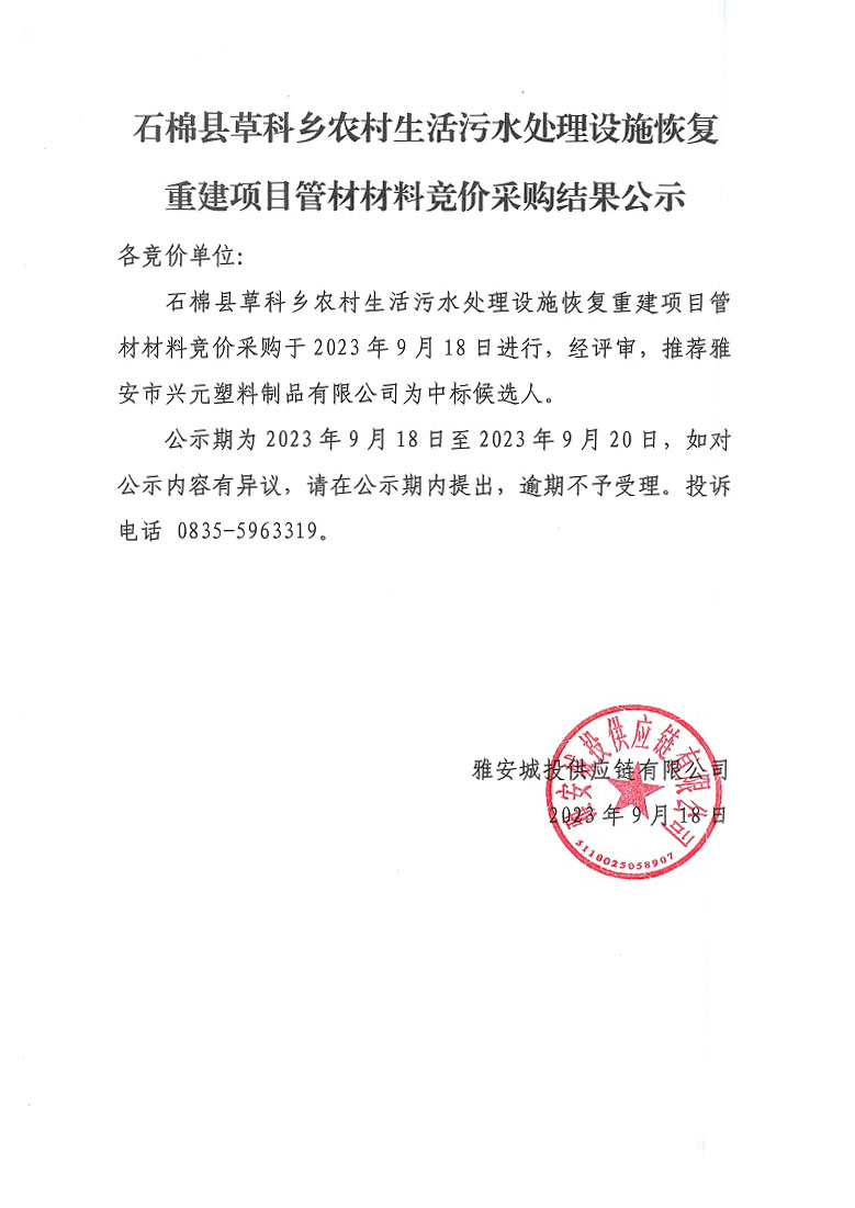 石棉縣草科鄉(xiāng)農(nóng)村生活污水處理設施恢復重建項目管材材料競價采購結果公示