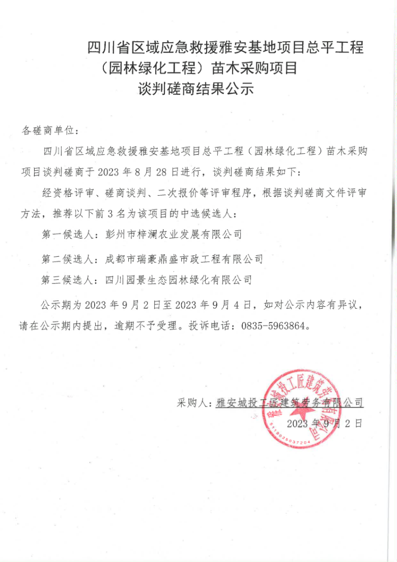 四川省區(qū)域應(yīng)急救援雅安基地項(xiàng)目總平工程(園林綠化工程)苗木采購(gòu)項(xiàng)目談判磋商結(jié)果公示
