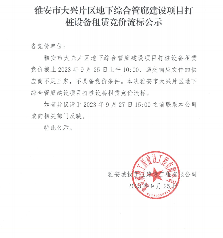 雅安市大興片區(qū)地下綜合管廊建設(shè)項(xiàng)目打樁設(shè)備租賃競價(jià)流標(biāo)公示