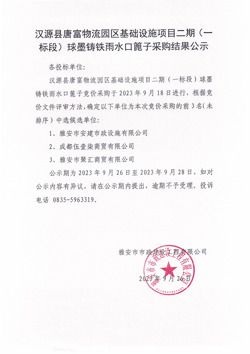 漢源縣唐富物流園區(qū)基礎設施項目二期(一標段)球墨鑄鐵雨水口篦子采購結果公示