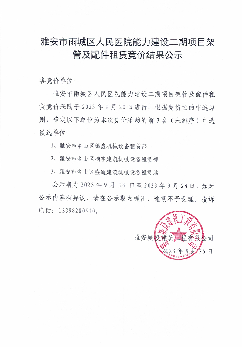 雅安市雨城區(qū)人民醫(yī)院能力建設(shè)二期項(xiàng)目架管及配件租賃競(jìng)價(jià)結(jié)果公示