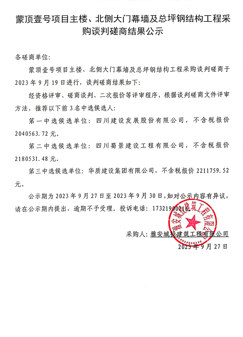 蒙頂壹號(hào)項(xiàng)目主樓、北側(cè)大門幕墻及總坪鋼結(jié)構(gòu)工程采購談判磋商結(jié)果公示