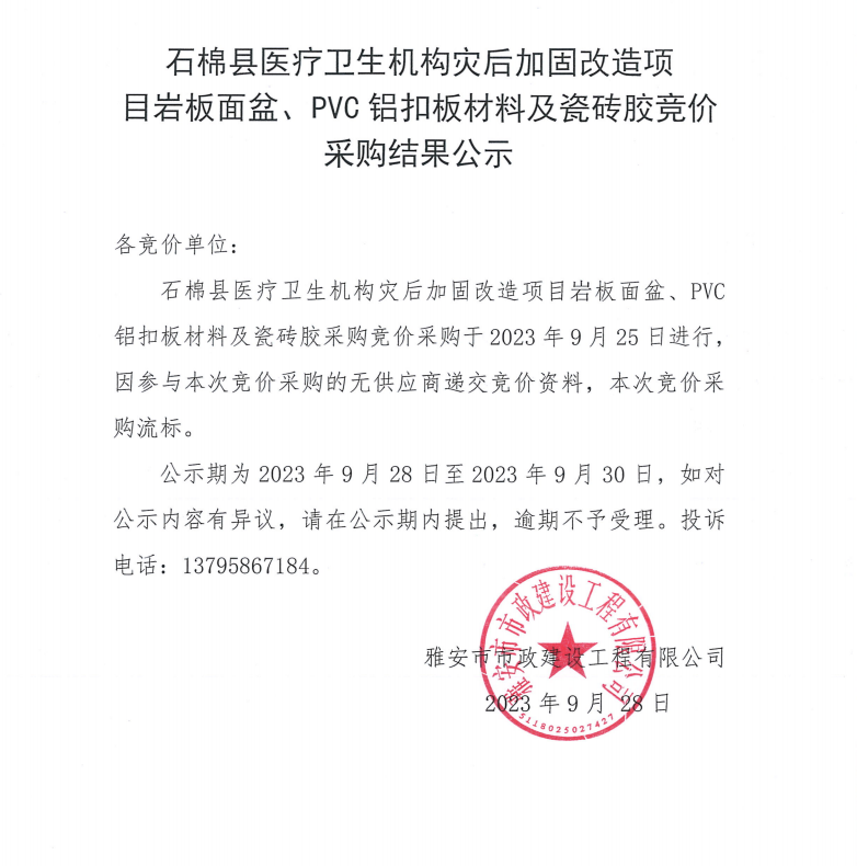 石棉縣醫(yī)療衛(wèi)生機(jī)構(gòu)災(zāi)后加固改造項(xiàng)目巖板面盆、PVC鋁扣板材料及瓷磚膠競(jìng)價(jià)采購(gòu)結(jié)果公示