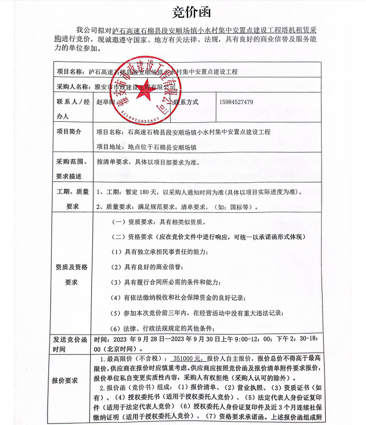 瀘石高速石棉縣段安順場鎮(zhèn)小水村集中安置點(diǎn)建設(shè)工程塔機(jī)租賃采購競價(jià)公告