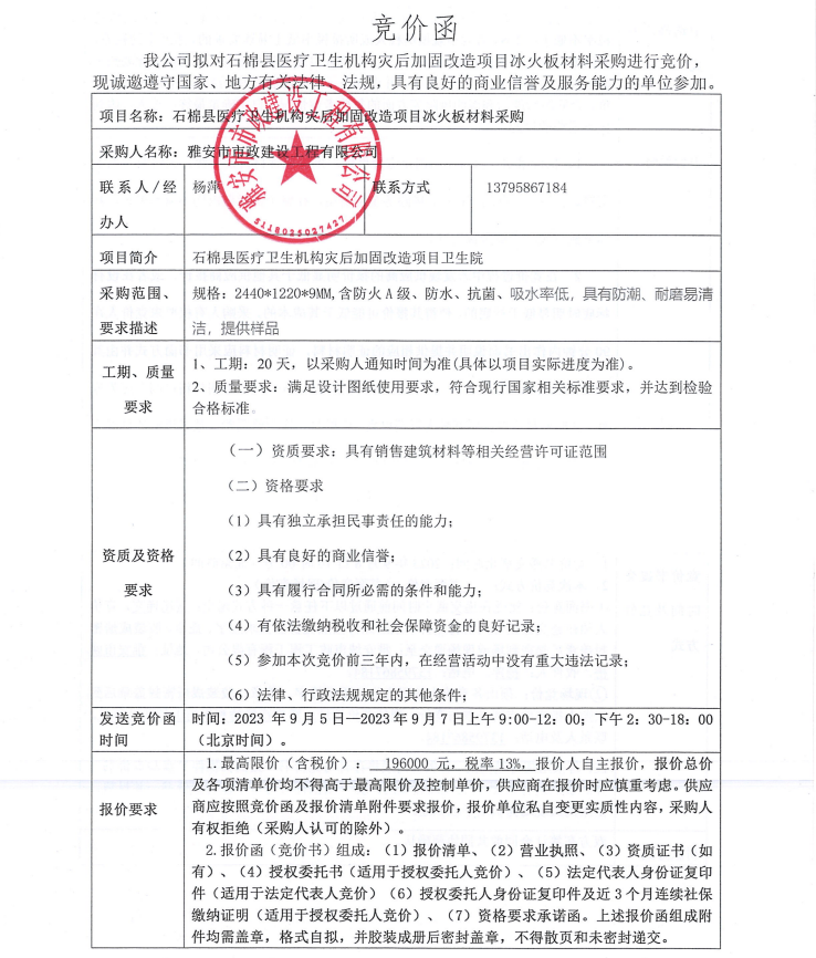 石棉縣醫(yī)療衛(wèi)生機構(gòu)災后加固改造項目冰火板材料采購競價公告