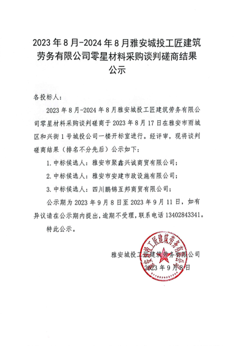 2023年8月-2024年8月雅安城投工匠建筑勞務有限公司零星材料采購談判磋商結果公示