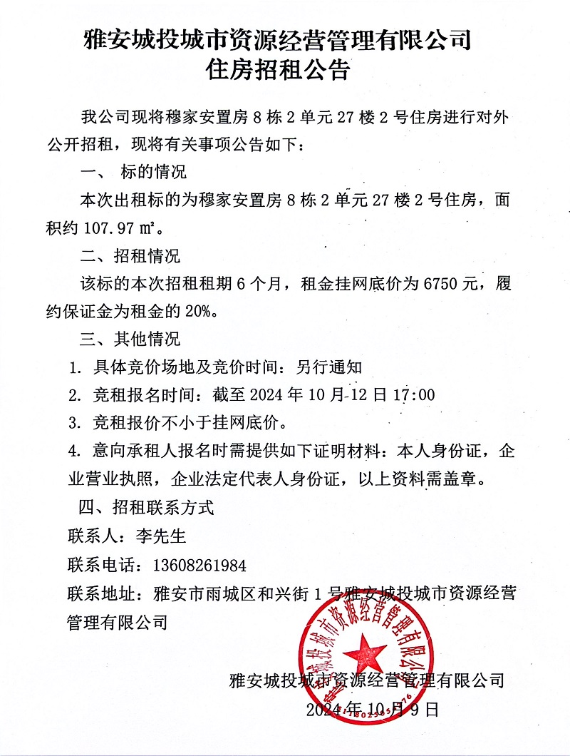雅安城投城市資源經(jīng)營(yíng)管理有限公司關(guān)于穆家安置房8棟2單元27樓2號(hào)住房招租公告
