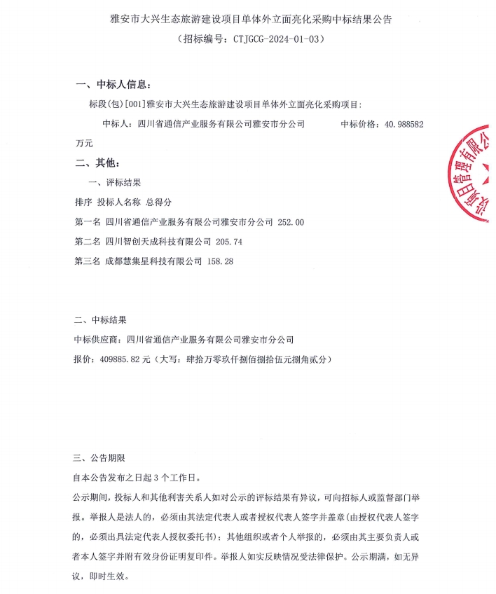 雅安市大興生態(tài)旅游建設(shè)項(xiàng)目單體外立面亮化采購(gòu)中標(biāo)結(jié)果公告
