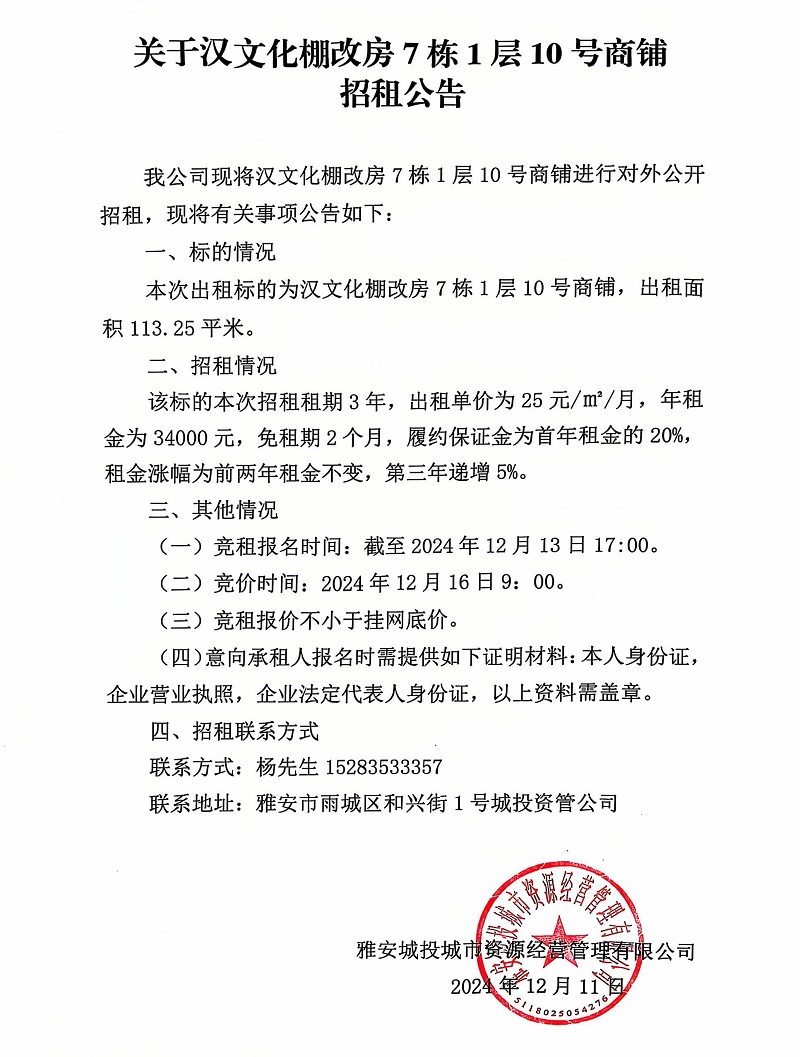 關(guān)于漢文化棚改房7棟1層10號(hào)商鋪的招租公告