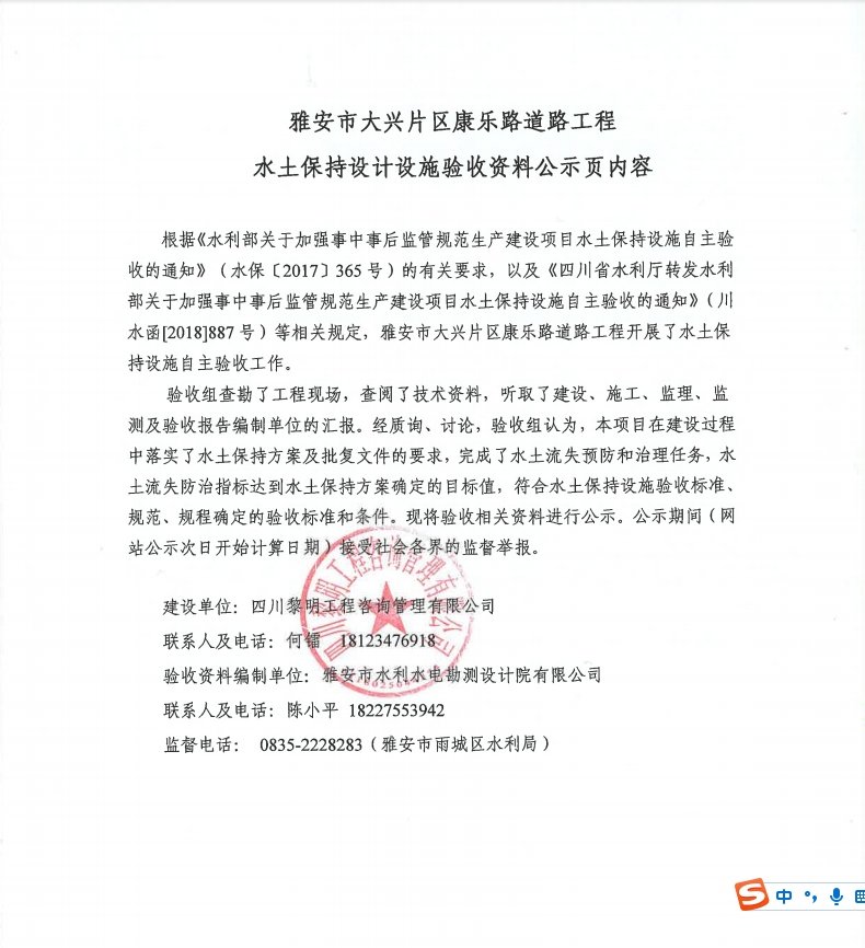 雅安市大興片區(qū)康樂路道路工程水土保持設(shè)計設(shè)施驗(yàn)收資料公示頁內(nèi)容