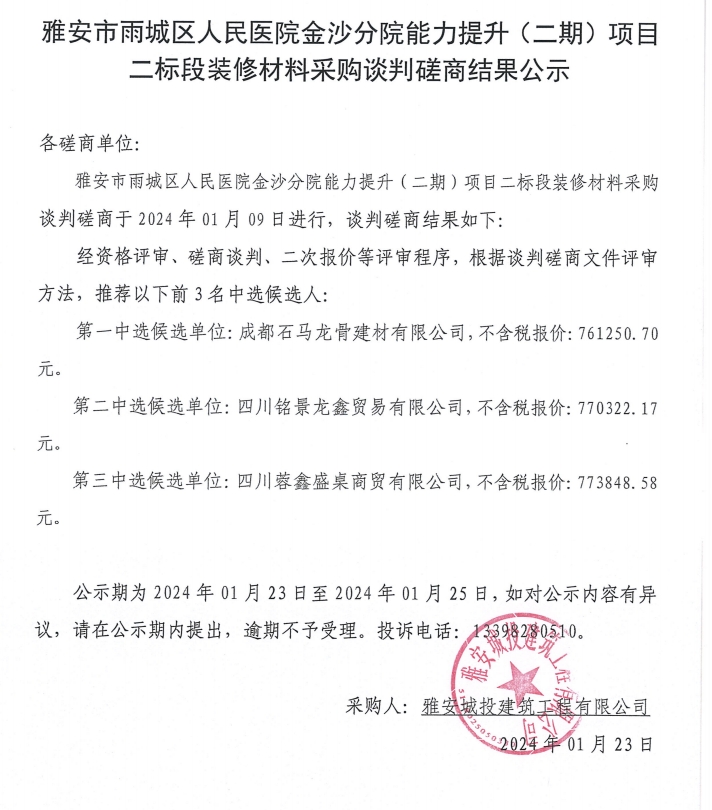 雅安市雨城區(qū)人民醫(yī)院金沙分院能力提升(二期)項目二標段裝修材料采購談判磋商結果公示