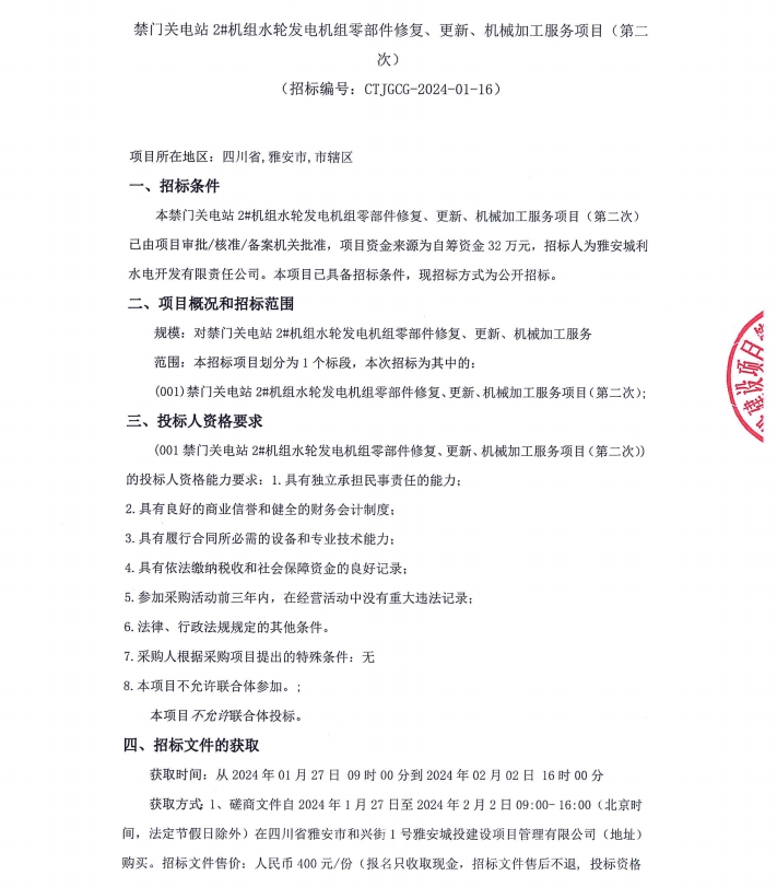 禁門關(guān)電站2#機(jī)組水輪發(fā)電機(jī)組零部件修復(fù)、更新、機(jī)械加工服務(wù)項(xiàng)目(第二次)公告