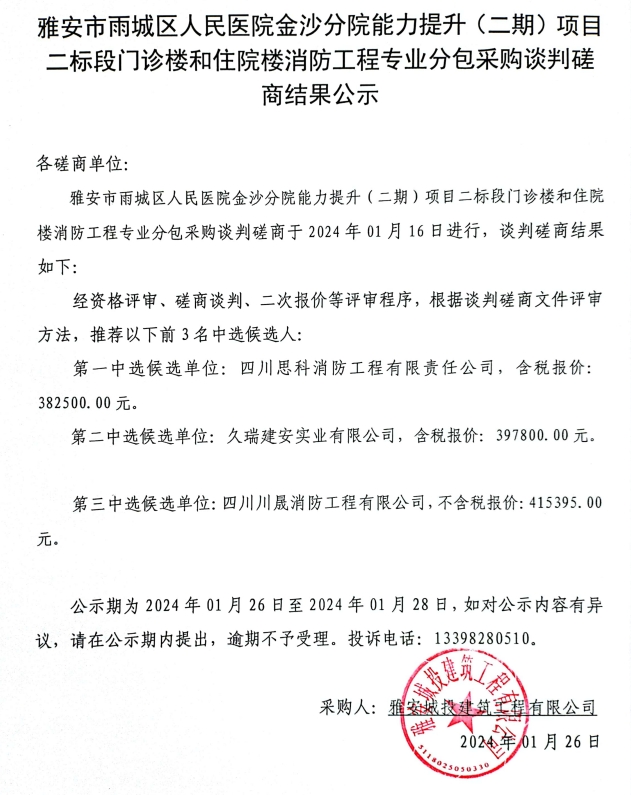 雅安市雨城區(qū)人民醫(yī)院金沙分院能力提升(二期)項目二標段門診樓和住院樓消防工程專業(yè)分包采購談判磋商結果公示