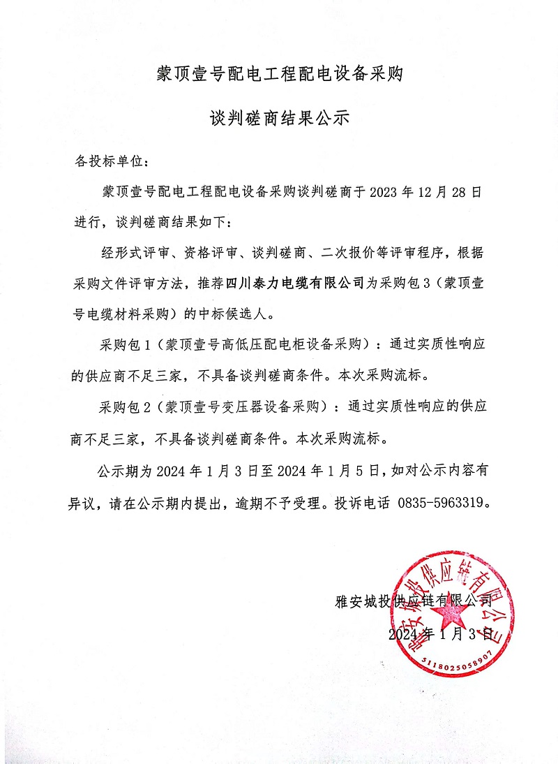 蒙頂壹號配電工程配電設備采購談判磋商結(jié)果公示