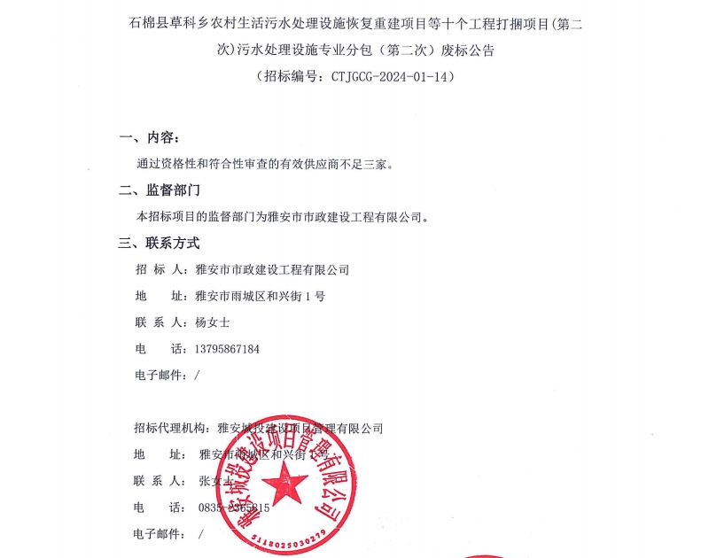 石棉縣草科鄉(xiāng)農(nóng)村生活污水處理設(shè)施恢復(fù)重建項(xiàng)目等十個(gè)工程打捆項(xiàng)目(第二次)污水處理設(shè)施專(zhuān)業(yè)分包(第二次)廢標(biāo)公告