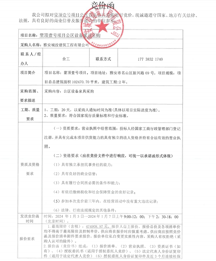 蒙頂壹號(hào)項(xiàng)目公區(qū)設(shè)備家具采購競(jìng)價(jià)公告