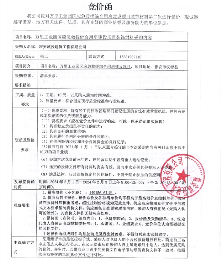 萬里工業(yè)園區(qū)應(yīng)急救援綜合用房建設(shè)項(xiàng)目裝飾材料采購(第二次)競(jìng)價(jià)公告