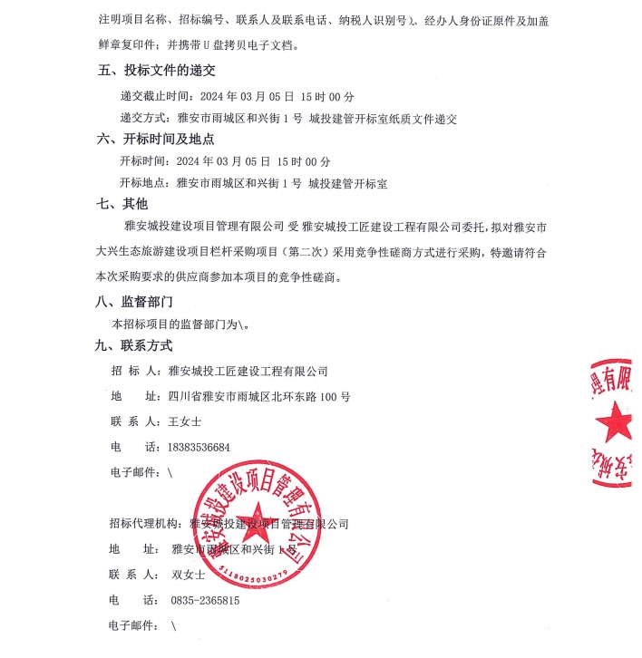雅安市大興生態(tài)旅游建設(shè)項目欄桿采購項目(第二次)公告