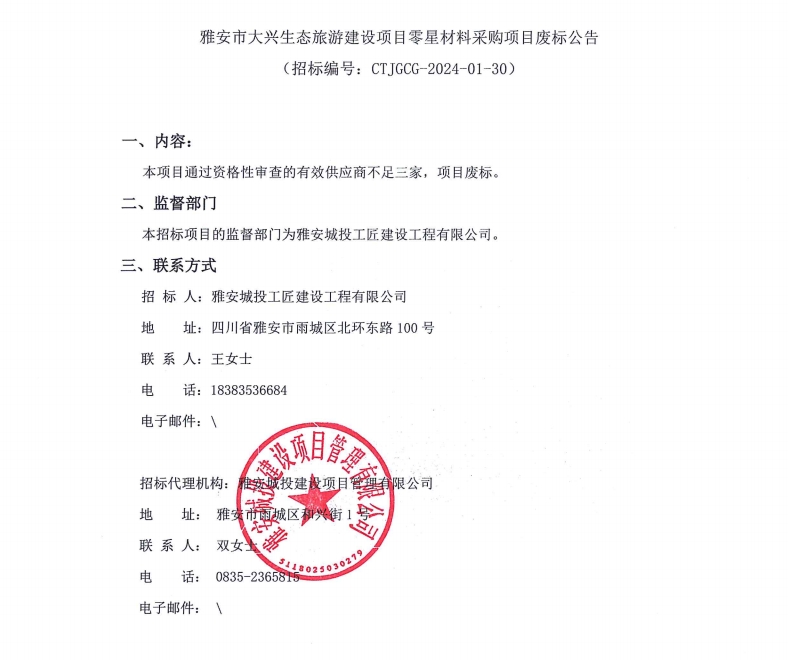 雅安市大興生態(tài)旅游建設(shè)項(xiàng)目零星材料采購項(xiàng)目廢標(biāo)公告